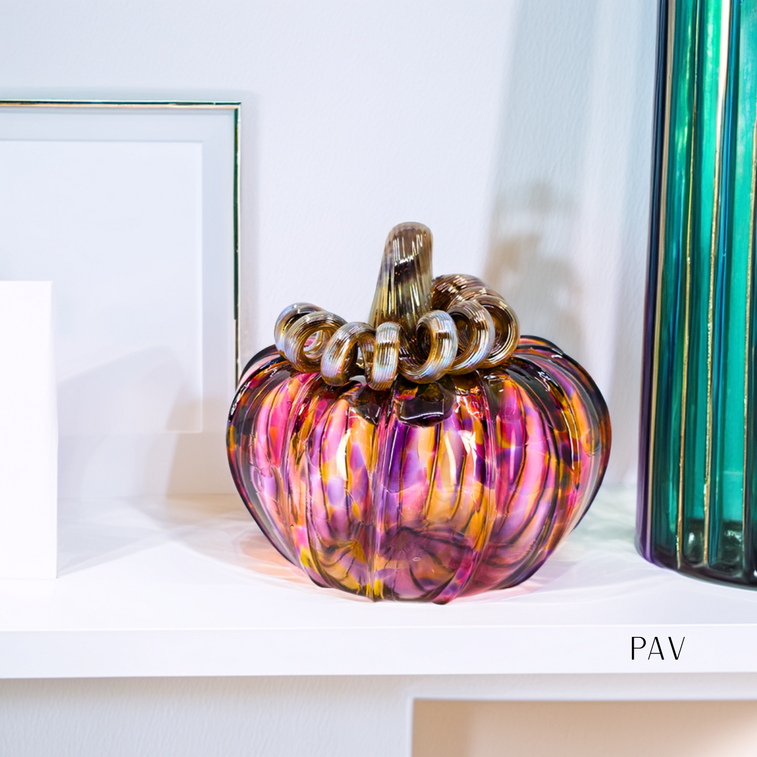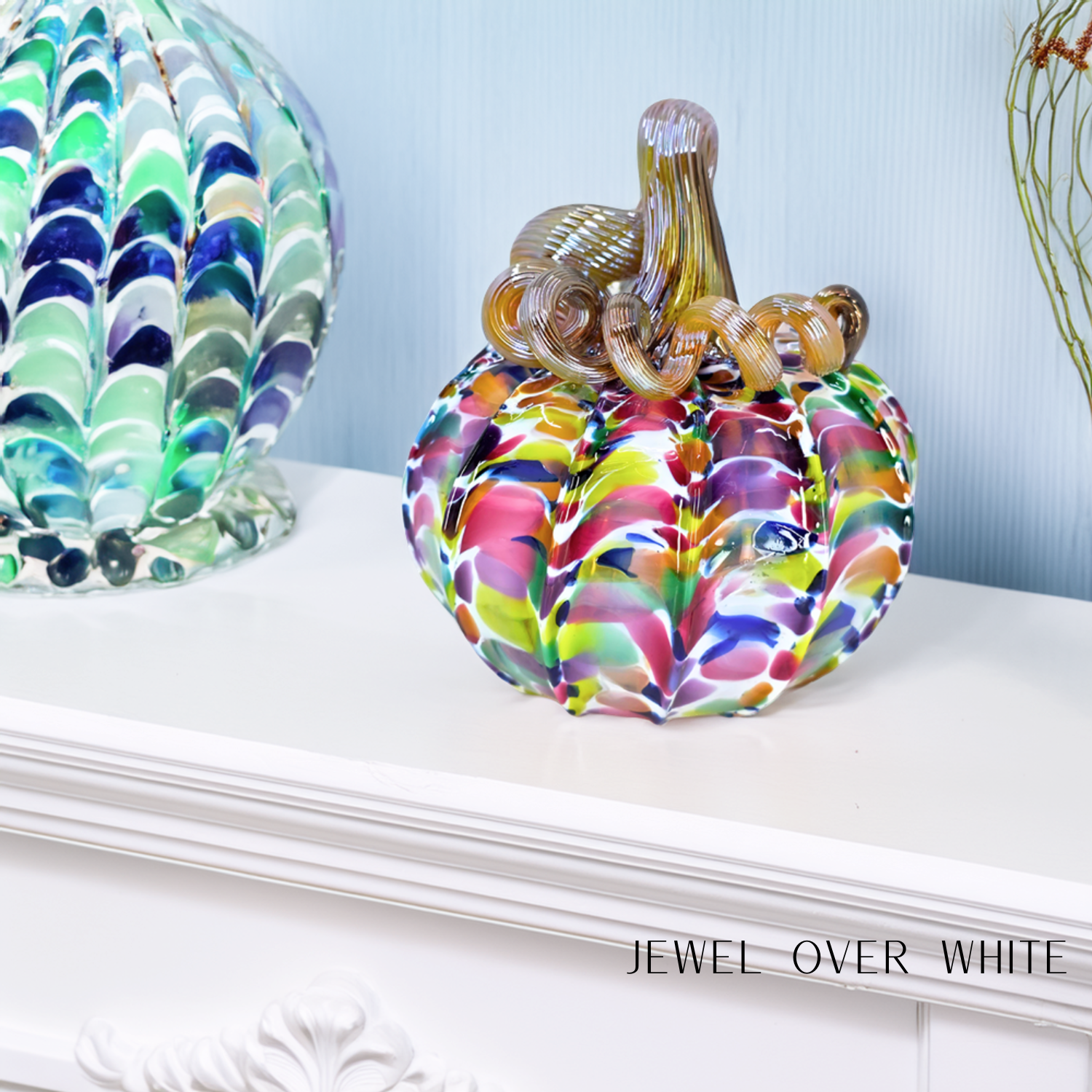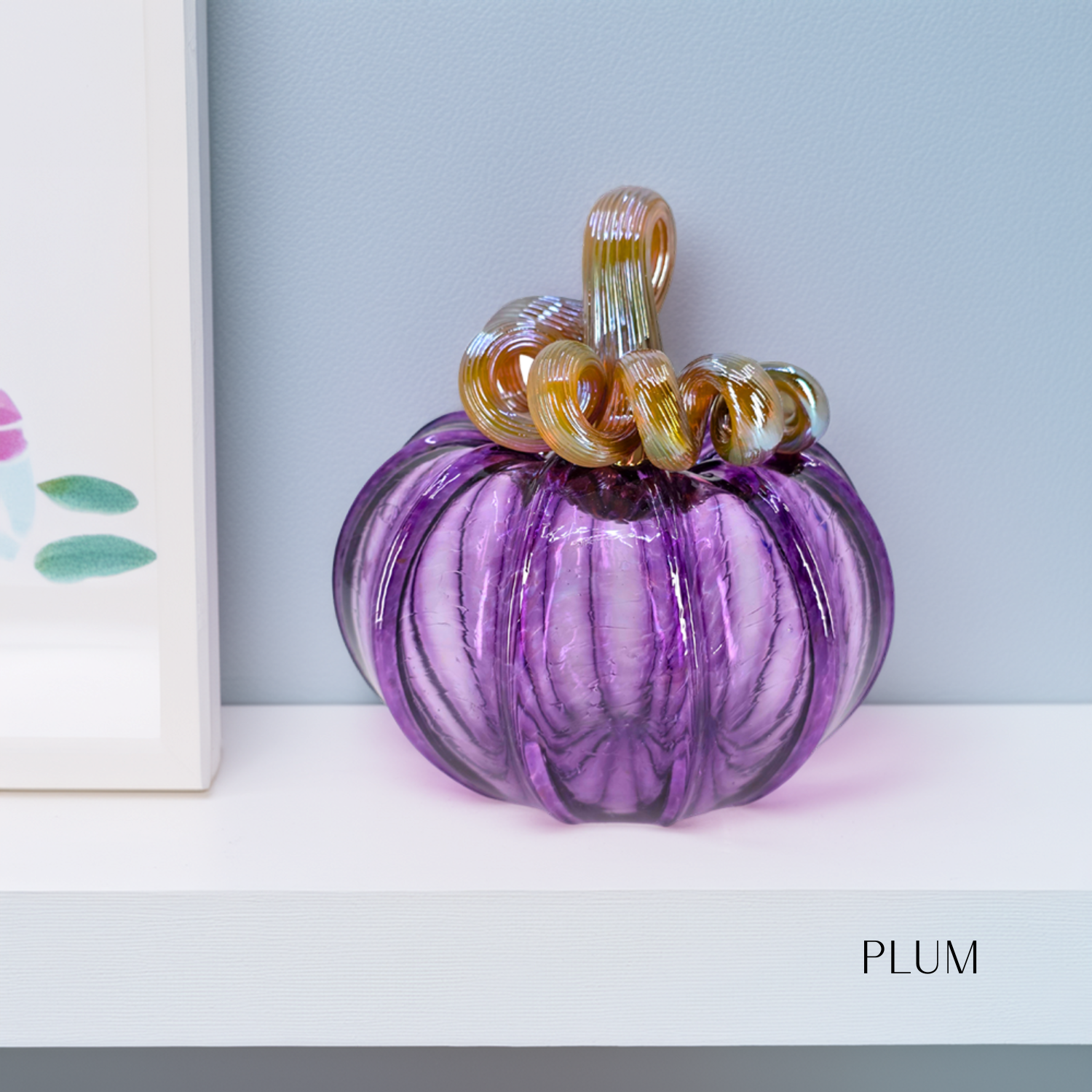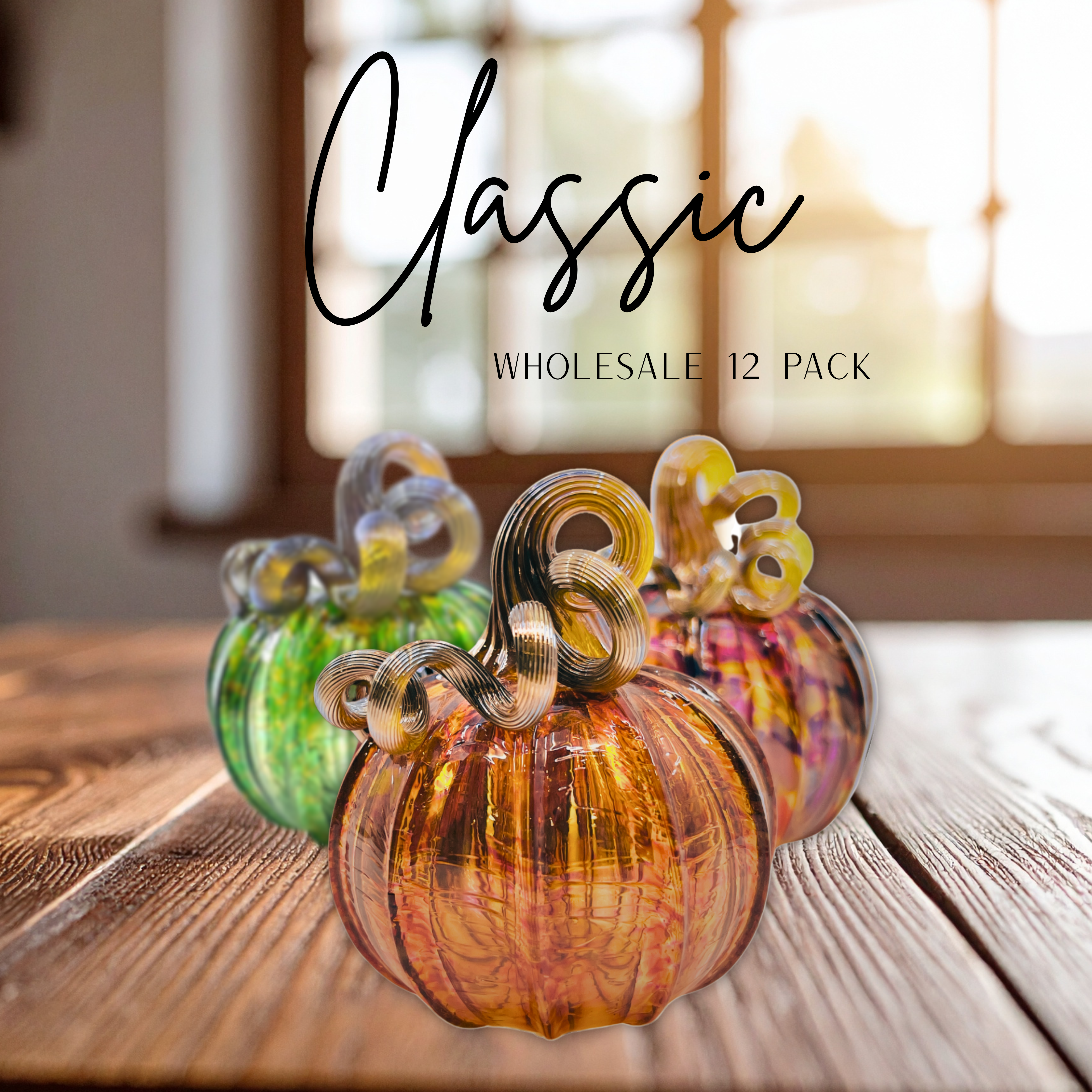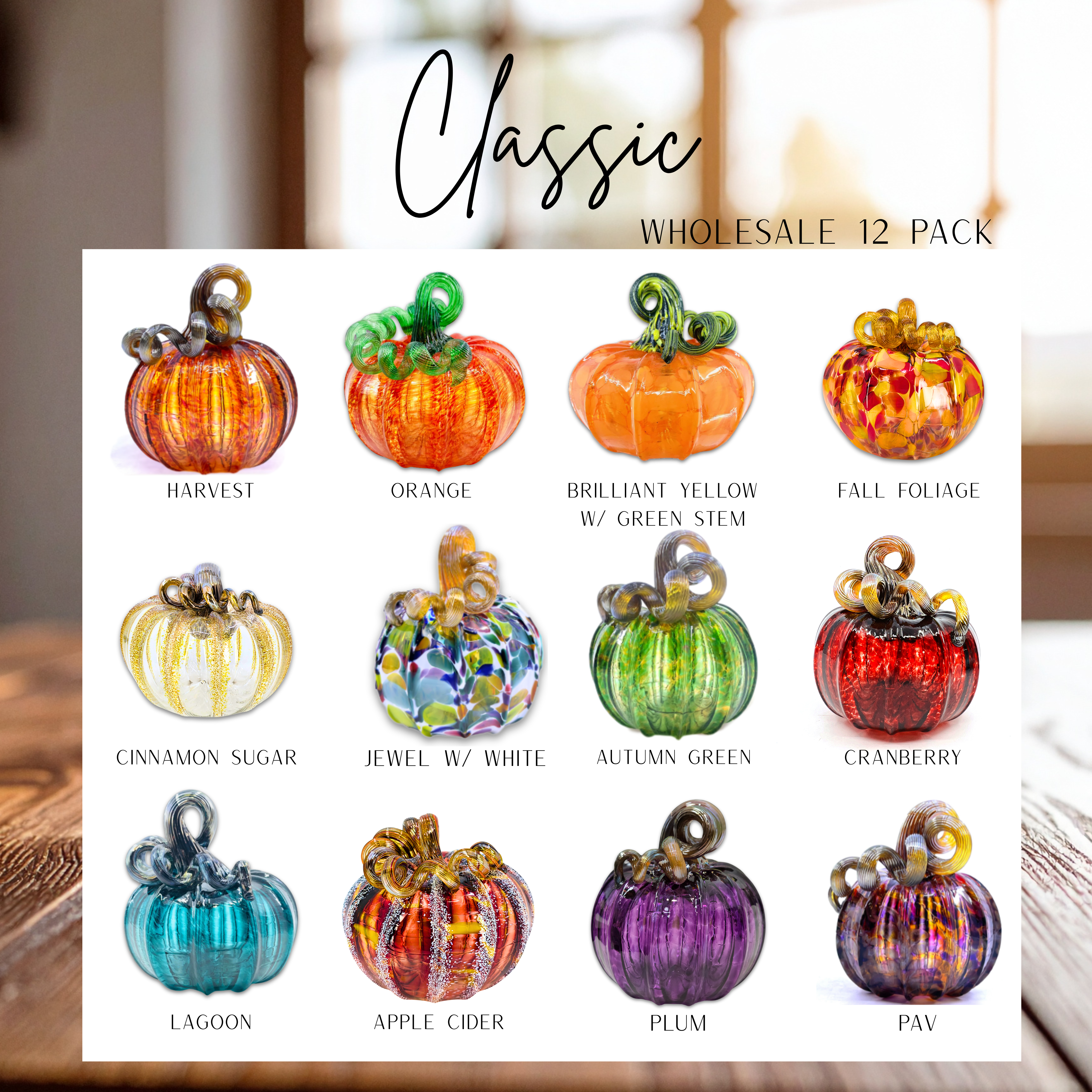 Elevate your store's offerings with this wholesale set of 12 handcrafted pumpkins, featuring 12 pumpkins in our classic colors: Harvest, Orange, Brilliant Yellow, Fall Foliage, Cinnamon Sugar, Jewel over White, Autumn Green, Cranberry, Lagoon, Apple Cider, Plum, and PAV. Each mini pumpkin measures approximately 4 x 4 inches, while the squat pumpkins are about 5 x 5 inches. Handcrafted by the skilled artisans at Luke Adams Glassblowing Studio in Norwood, MA.